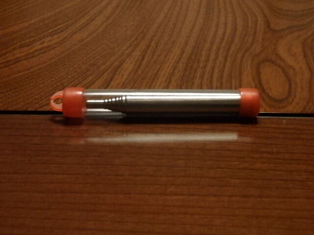 ケースから取り出し、ロッドアンテナの要領で引っ張るとこんなに長くなります。火吹き棒だそうです。口を付ける物だから、こうしてケースがあるのは衛生上よいかもしれませんね。