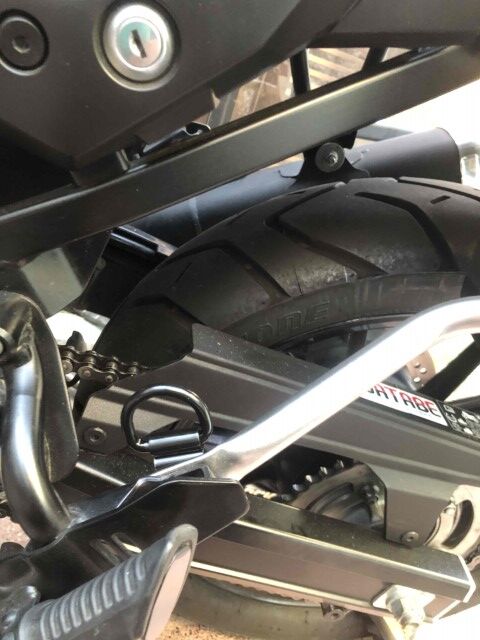 こんな感じに、タンデムステップの裏にサイドケースキャリアの支点と共締めで設置しました。ここにヒバリ結びでロックストラップをかけるのです。