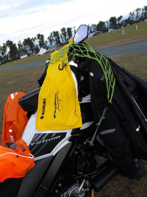 日が照っているし、風もあるのでどんどん乾いていきます。飛ばされないように注意が必要です。他のV-STROMキャンパーたちとの交流もあり、なかなか楽しい朝を過ごせました。また、LINEでは高校同級生達や担任の奥様とのやり取りも。