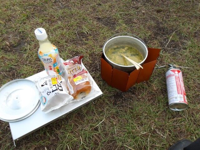朝食を作ります。風が強めで、テント裏に入っても風が炎を揺らしてしまうので防風スクリーンを使用しました。