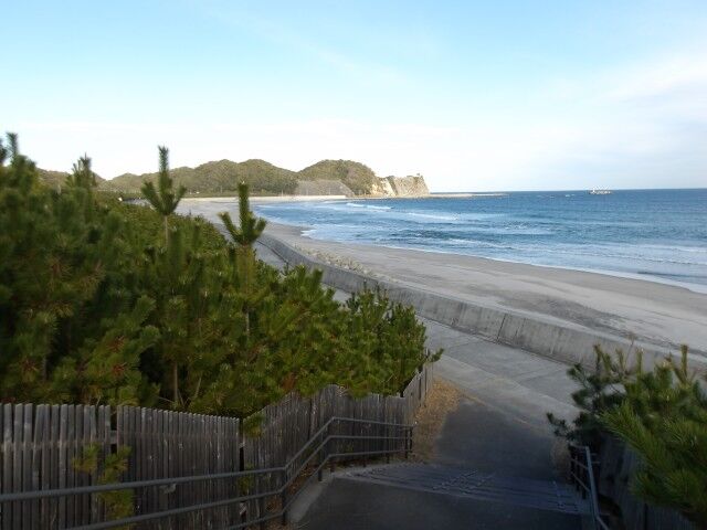 外に出てみましょう。風が強い!立っているのがやっと、恐怖を感じるほどです。こちらは薄磯海岸です。こちらもすっかり変ってしまいましたね。