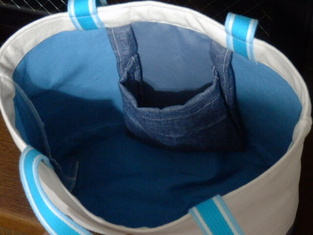 夕方に起きたら、材料を集め、図面を書いて、製作開始です。作り始めたら早いもの、2時間程度で完成しました。帆布で作ったトートバッグです。底の切り返しはソファカバーとお揃い、つまりは息子のカーテン生地の残りに材料を求めました。